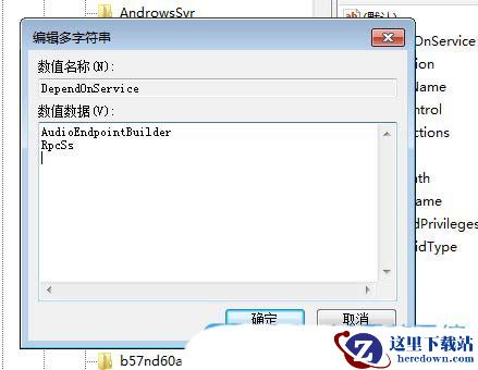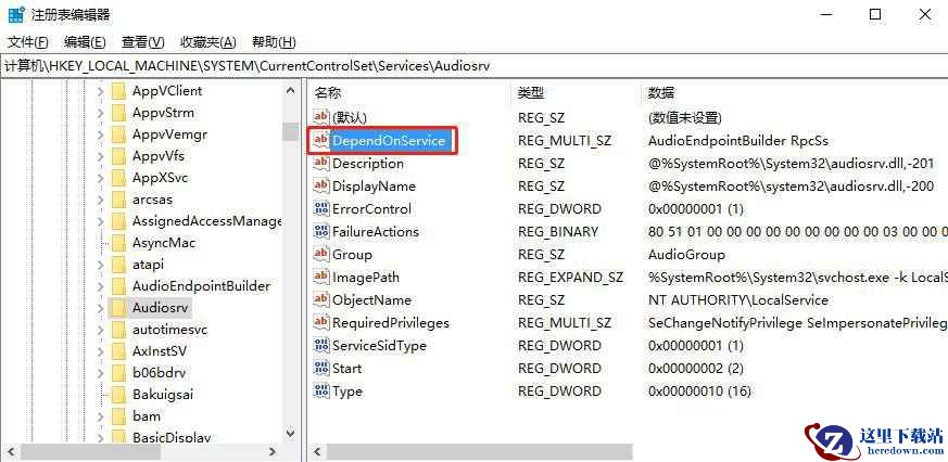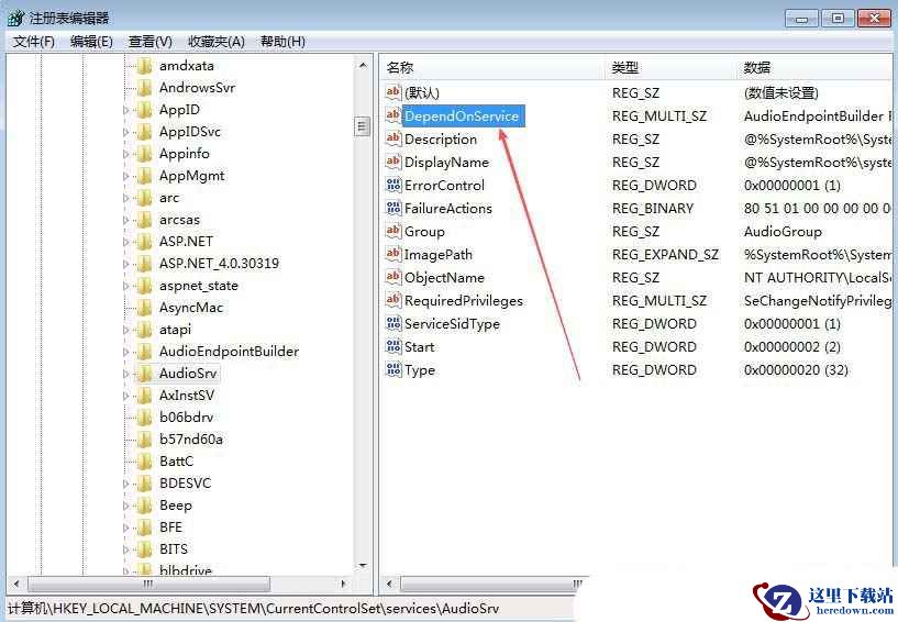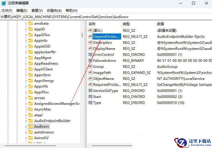3、左侧点击Audiosrv,在右侧找到并双击打开DependOnService;