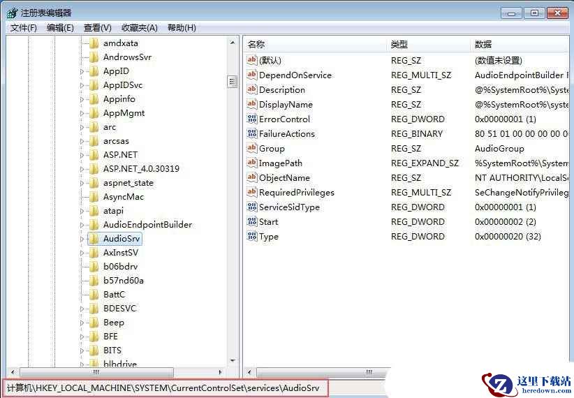 2、注册表编辑器窗口中,依次展开到:HKEY_LOCAL_MACHINESYSTEMCurrentControlSetServicesAudiosrv;