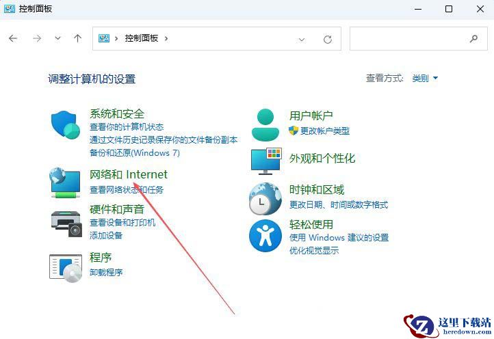 1、首先,打开系统的控制面板界面,点击打开下方的“网络和internet”设置。