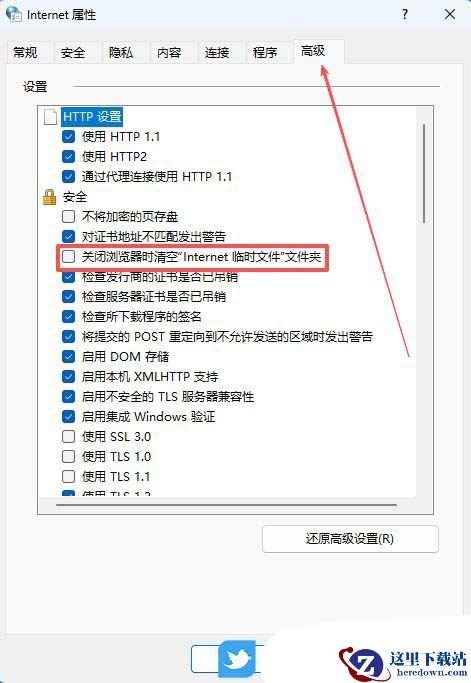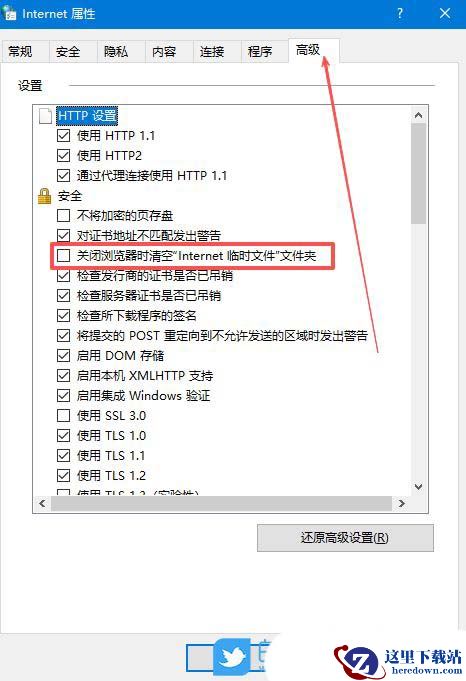 3、随后,在弹出的窗口中,切换到“高级”选项栏,再勾选下方的“关闭浏览器时清空Internet临时文件文件夹”选项,点击确定即可。