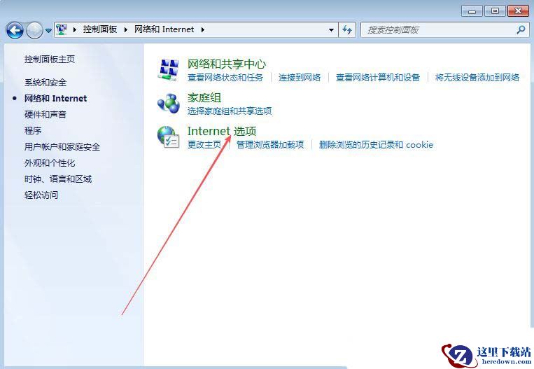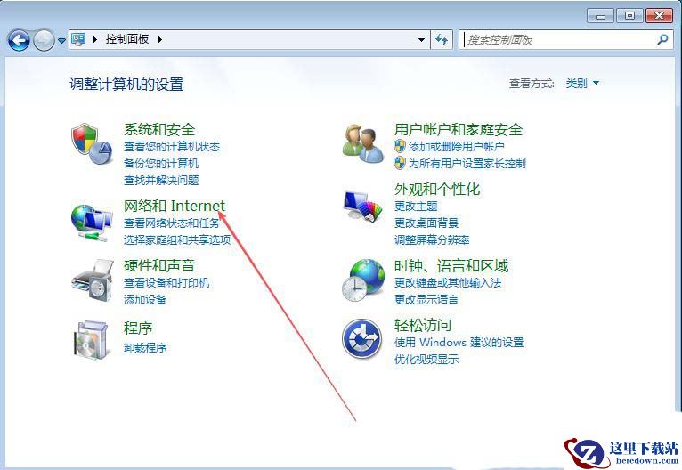 1、首先,打开Win7系统的控制面板界面,选择进入到下方的“网络和internet”设置。