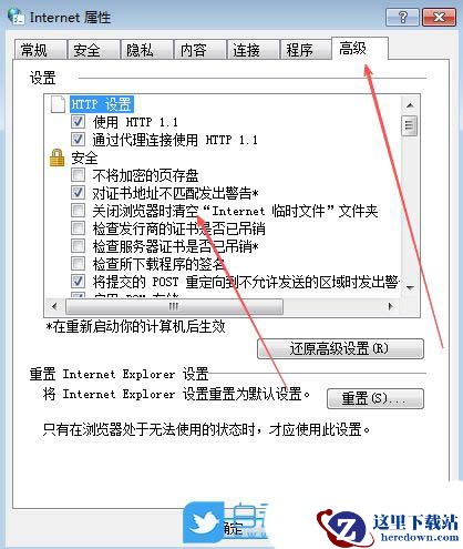 3、然后,在弹出的窗口中,切换到“高级”选项栏,再勾选下方的“关闭浏览器时清空Internet临时文件文件夹”选项,点击确定即可。