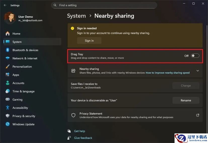 针对此前引发争议的“拖拽托盘”(Drag Tray)功能,微软听取了用户反馈,在“设置 > 系统 > 就近共享”中新增了一个官方开关。