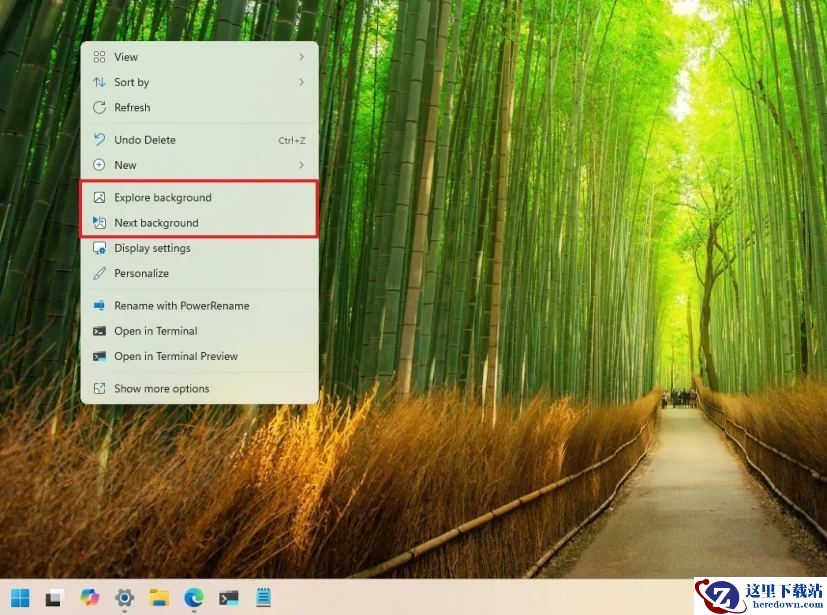 在 Windows Spotlight 设置为桌面背景后,右键菜单现在包含“查看此背景详情”和“下一个桌面背景”等选项。