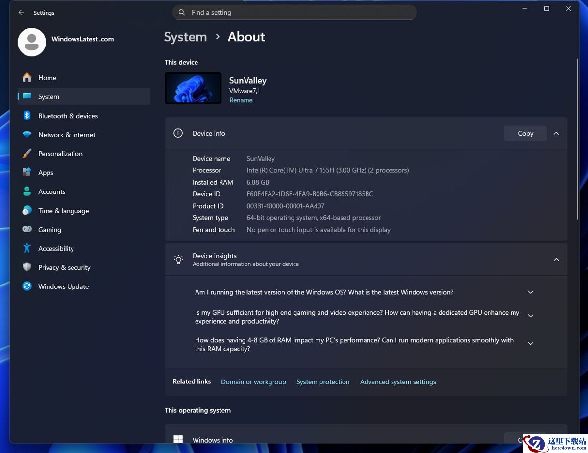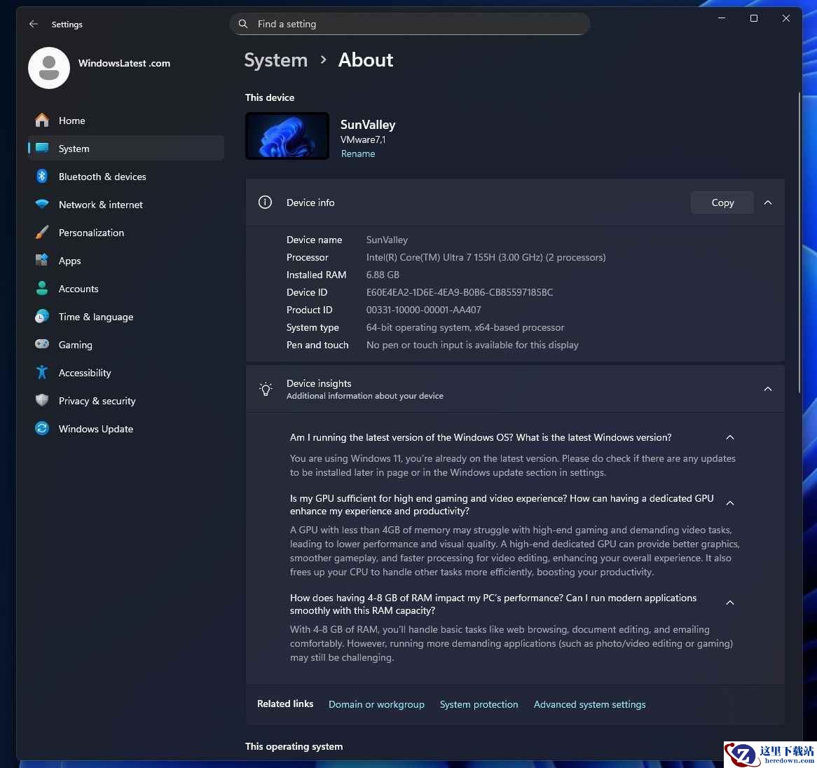 此次更新的另一大亮点是“设置”菜单的改版。微软在“系统 > 关于”页面中,正式将原本的“常见问题(FAQ)”板块更名为“设备洞察(Device Insights)”。