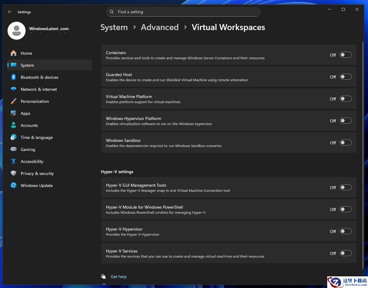 此前散落在控制面板“可选功能”中的 Windows 沙盒(Sandbox)、Hyper-V 管理工具、虚拟机平台以及容器服务等功能,现在均可直接在设置中一键开启或关闭,极大简化了开发人员和极客用户的配置流程。