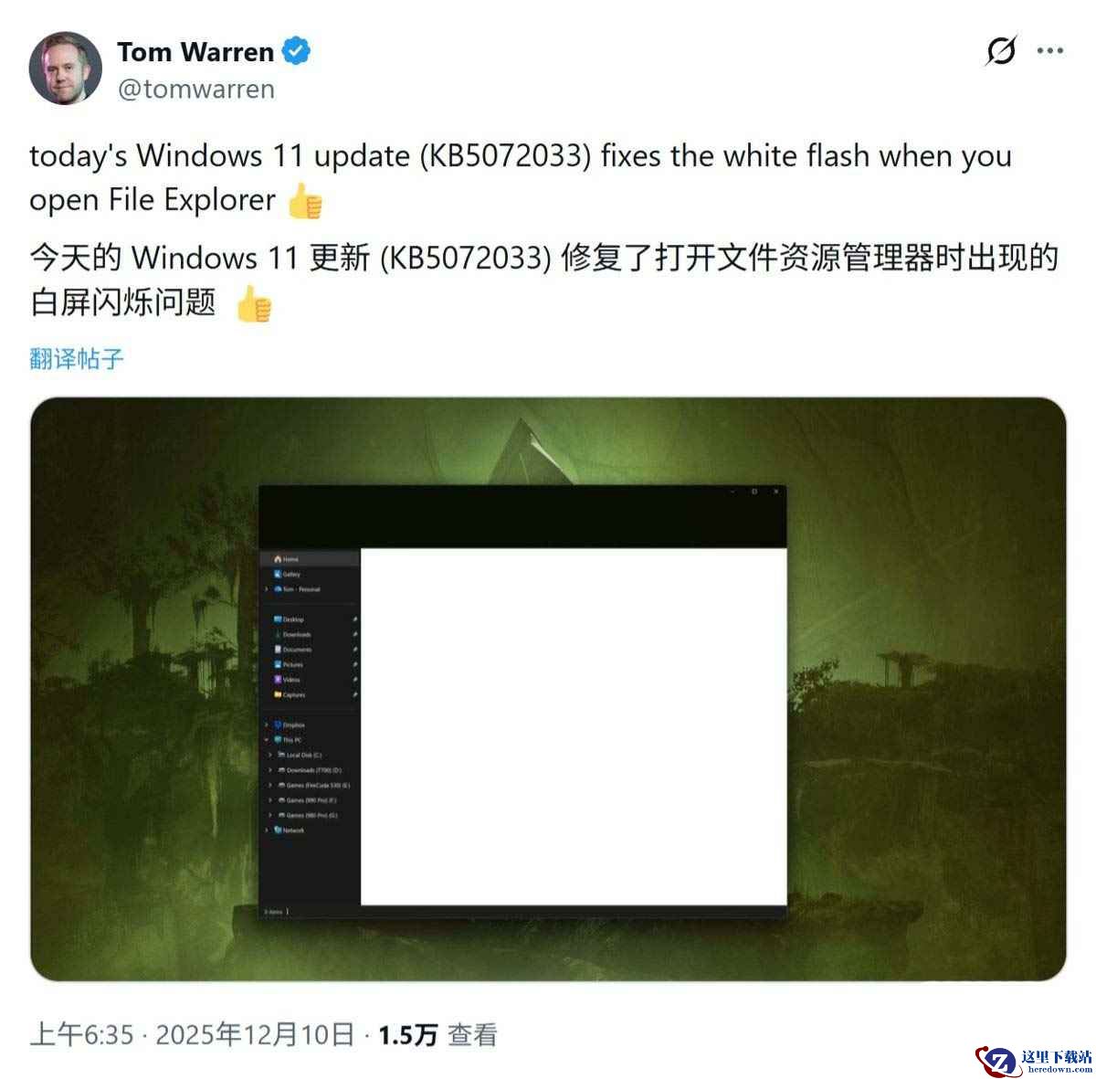 本次更新修复了文件资源管理器的深色模式体验,修复用户在打开新标签页、切换文件夹或点击详细信息面板后,屏幕会突然出现刺眼的白色闪烁问题。