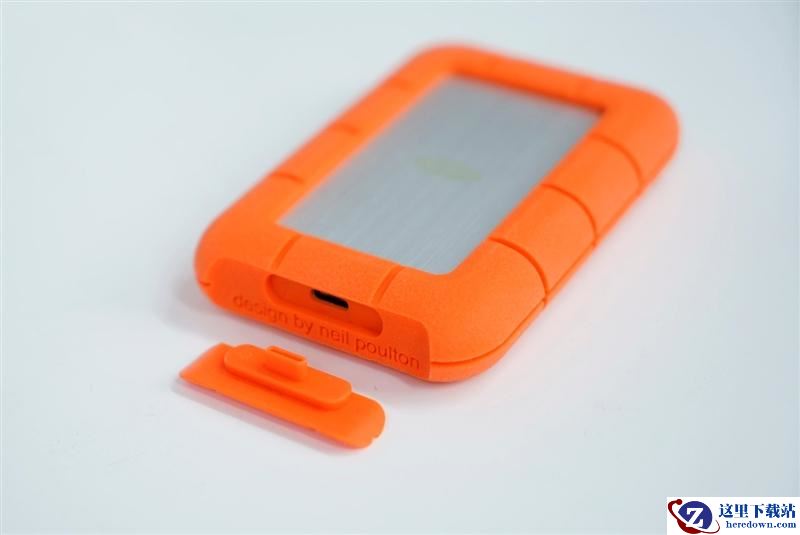 LaCie Rugged SSD4金刚钻Plus并没有采用超薄设计,十分厚实的橘色防撞边框提供了极为可靠的防护能力,拿在手里的防滑效果也极佳,几乎不可能发生意外脱手的情况。