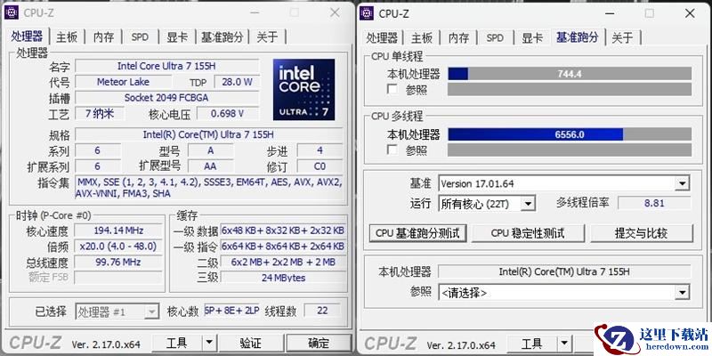 酷睿Ultra 7 155H单核分数744,多核分数6556。