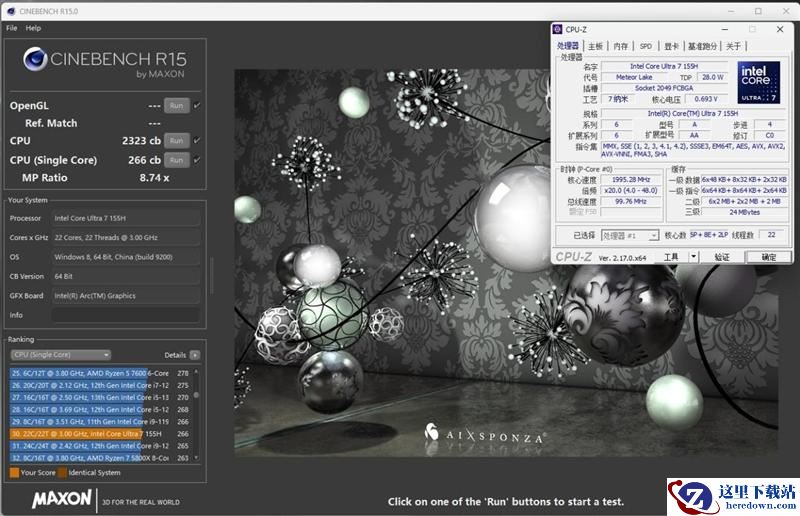 酷睿Ultra 7 155H单线程分数266b,多线程分数2323cb。