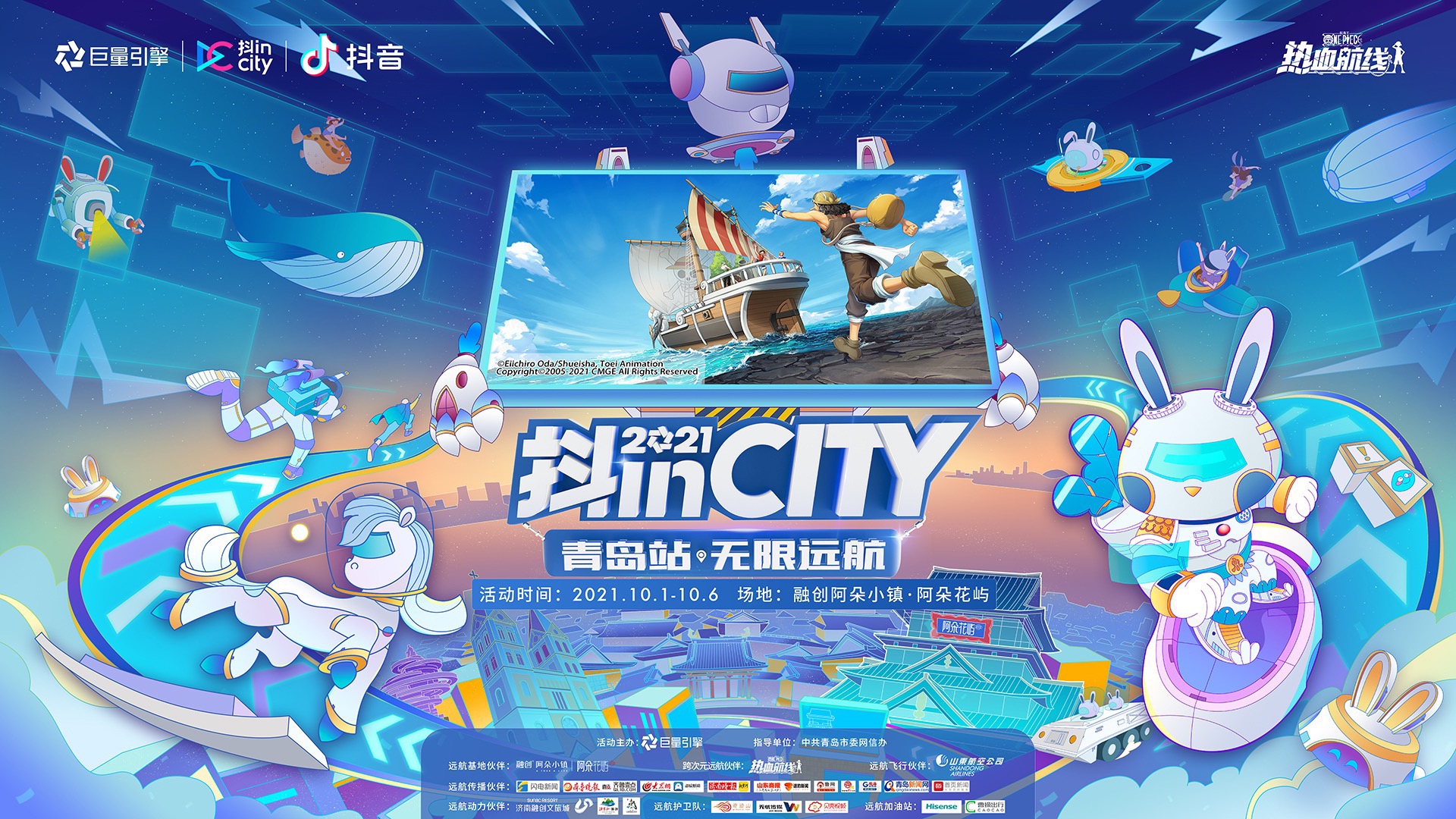 2021“抖inCity城市美好生活节青岛站·无限远航”来了!今年“抖inCity青岛站·无限远航”携手《航海王热血航线》,邀请明星、达人、玩家、游客一起乘风破浪!“抖inCity”作为近年来深受年轻人喜爱的城市活动,拥有着无可比拟的独特魅力。本次活动将于9月24日-10月7日,在山东青岛落地。活动主题为“无限远航”,意喻从今年开始在星辰大海中无限远航。