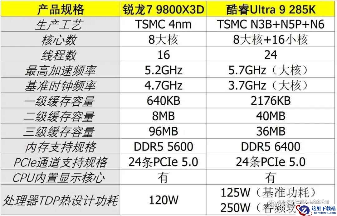 酷睿Ultra 9 285K的E Core能效核则拥有总计16颗核心、16条计算线程,其最高睿频频率为4.6GHz,因此它拥有较强的多核心性能。代价就是功耗不低,尽管采用了先进的生产工艺,但酷睿Ultra 9 285K的最高睿频功耗仍达到250W,比第14代酷睿处理器的i9、i7产品睿频TDP仅低了3W。此外,虽然酷睿 ULTRA 9 285K的核心数较多,但它的缓存容量相比锐龙7 9800X3D却更少,其二、三级缓存总容量只有76MB,比锐龙7 9800X3D少了28MB。