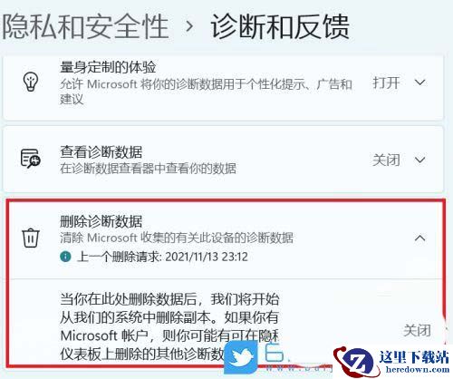 当前路径为:隐私和安全性 - 诊断和反馈,找到删除诊断数据(当你在此处删除数据后,我们将开始从我们的系统中删除副本。如果你有 Microsoft 账户,则你可能有可在隐私仪表板上删除的其他诊断数据)选项,点击打开,再点击删除按钮就完成了