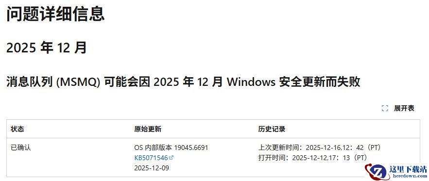微软今日更新了 Windows 10 已知问题清单,确认安装 2025 年 12 月 Windows 安全更新(KB5071546)后,用户可能会遇到消息队列 (MSMQ) 功能的问题。
