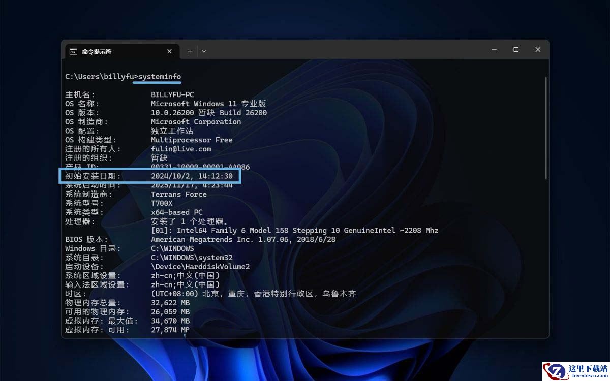 Windows 11 自带的systeminfo命令可以输出详细的硬件和系统信息,其中就包含了系统安装日期: