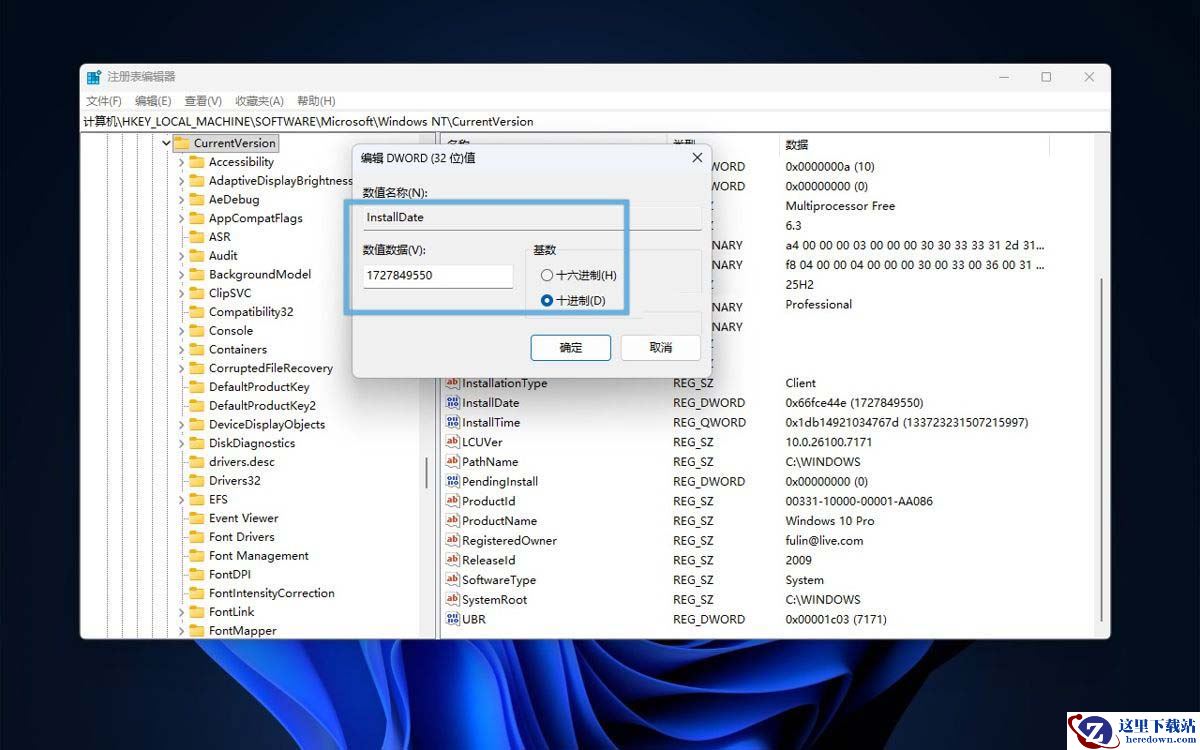 3、找到名为InstallDate的 DWORD (32-位) 值,记录「十进制」数值。