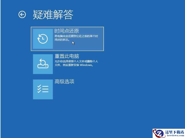 3、系统重启后,在 WinRE 恢复环境中,依次进入「疑难解答」>「时间点还原」。