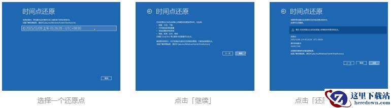 5、选择一个你想要恢复到的还原点,然后点击「继续」>「还原」。
