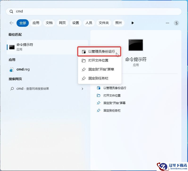 3. 按下 Win 键(或者使用鼠标)打开开始菜单,输入“cmd”,然后选择“以管理员权限”打开命令提示符。