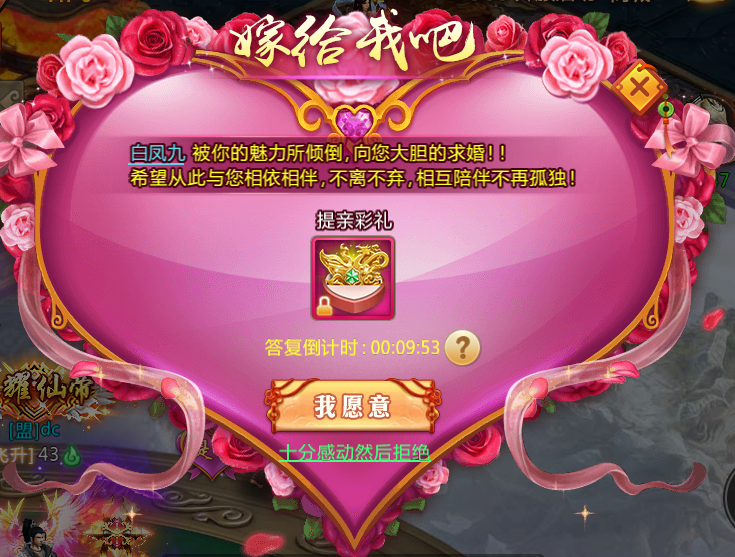 1.3:提亲玩家选择对应档位的彩礼提亲后,被提亲的玩家会收到提亲信息,被提亲的玩家将有10分钟的时间决定是否接受提亲,如果10分钟没有选择【我愿意】或者【十分感动然后拒绝】,系统将默认选择拒绝提亲。