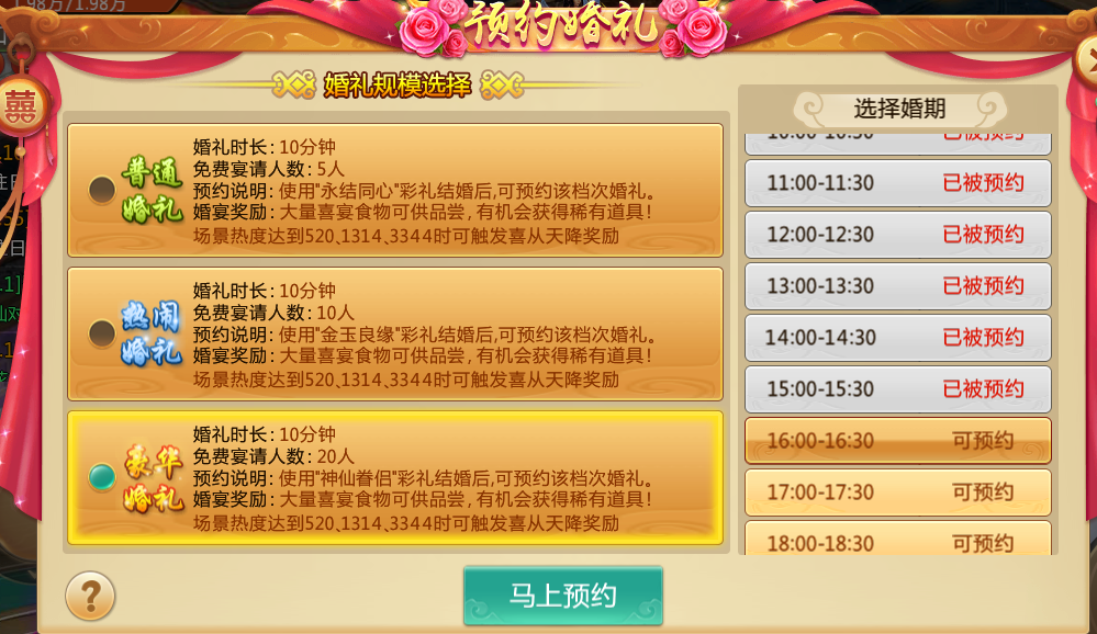 2.1:新人提亲成功后,可以通过【预约婚礼】界面选择婚礼规模以及婚礼时间