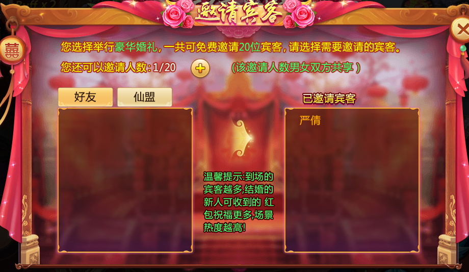 2.3:选择婚礼规模以及婚礼时间后,新人可以通过【邀请宾客】界面邀请参加婚礼的宾客,新人可以选择好友或者仙盟中盟友进行邀请,新人可以使用5元宝/绑元增加一位宾客。不同规模的婚礼可邀请宾客数量上限不同。