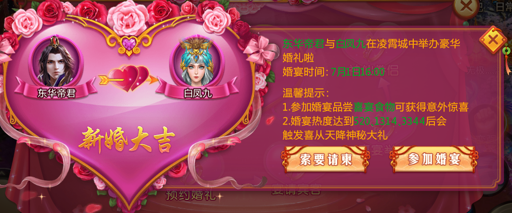 2.5:【索要请柬】:其他未被邀请的宾客可以在红娘处或点击游戏右上角的【婚礼】图标索要请柬参加新人的婚礼。
