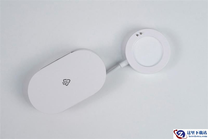 磁吸充电器特写,通过磁吸定位,两个镀金触电自动对齐手表背面的充电触点进行充电,由于手表电池较小,只支持10W充电,所以采用了USB-A的线缆。