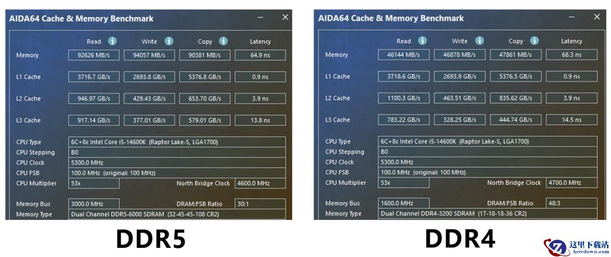 首先来看看同为酷睿i5-14600K CPU,分别搭配DDR4和DDR5时在内存理论性能表现上的区别。