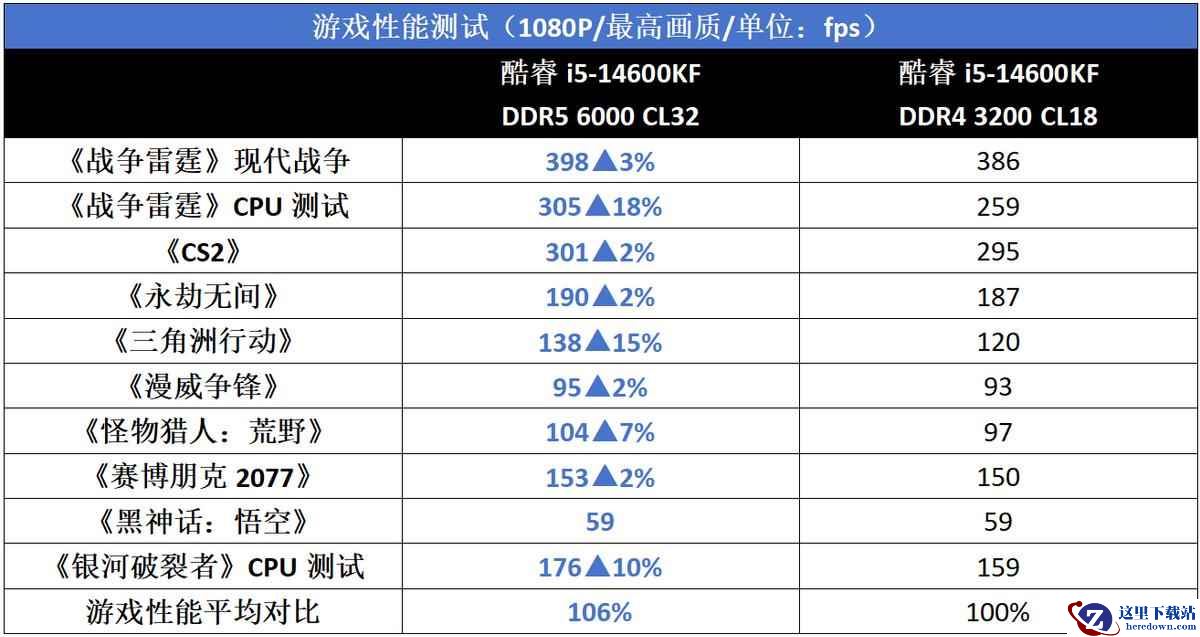 另外在《怪物猎人:荒野》这样的多人游戏中,酷睿i5-14600K+DDR5 6000相对酷睿i5 14600K + DDR4 3200的优势也是很大的,领先幅度达到了7%。综合全部游戏来看,酷睿i5-14600K+DDR5 6000平均领先的幅度为6%。可见在内存延迟并不占优势的前提下,DDR4 3200内存确实拖了酷睿i5-14600K很大的后腿。