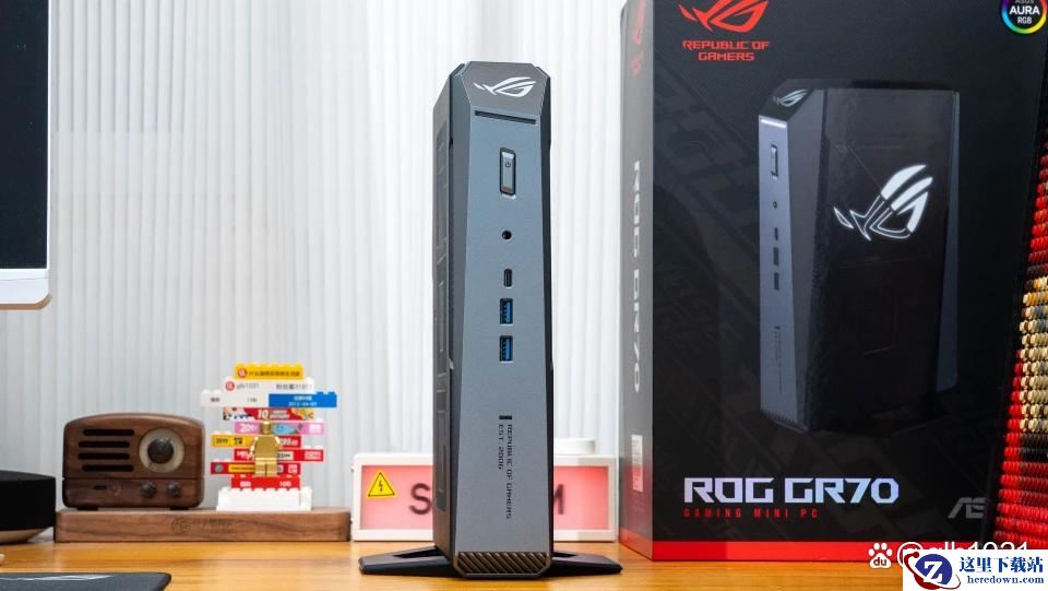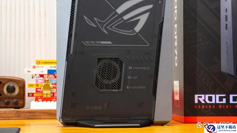 ROG 魔霸9 Mini 从包装里取出后就是自带支架,默认立式摆放的形式。三风扇设计,产品一侧ROG灯光区域下方还有开孔的风扇散热位置。