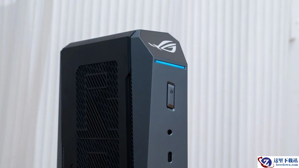 产品正面看上去就像是一款酷似科幻电影里的便携战术终端,紧凑体积下满是硬核机甲风,仿佛随时能启动次元跃迁。顶部是斜切处理的ROG败家之眼Logo,下方是一个斜切设计的灯带效果,支持神光同步。在下面是3.5音频孔、前置Type-C以及两个USB 3.2 Gen2 10Gbps的扩展接口。