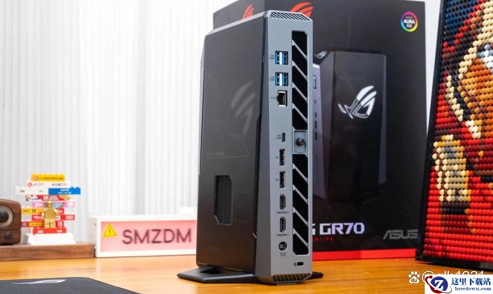 更多的IO扩展接口设计在了机身背后区域,从上至下依次有四个蓝色的USB 3.2 Gen2、2.5G有线网口、40Gbps的USB 4.0 Type-C接口、两个DP 1.4以及两个HDMI 2.1接口,最下方的则是圆形的DC供电接口。搭配支持DP输出的Type-C接口,这款魔霸9 Mini则最多可以实现5屏的4K显示输出,真的桌面小强了。