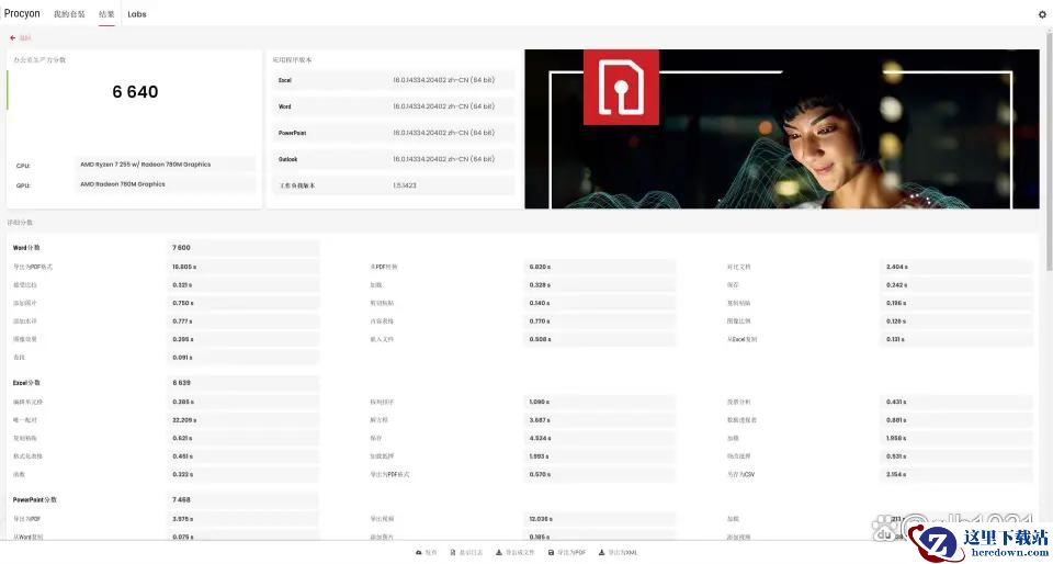 Procyon 测试中的办公生产力测试分数6640,Word 分数760,Excel 分数6639,PowerPoint 分数 7468。这个成绩与我之前自己组装的一台intel Ultra5 230F处理器的办公主机的办公生产力成绩相当,这点是让我很意外的。因为投入的价格与散热预算上哪台230F都要更好,但是实际测试分数上零刻SER9 Max迷你主机的成绩会略好。