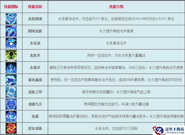 特色技能:龙卷四海、水清术、游龙叠浪、双龙戏珠