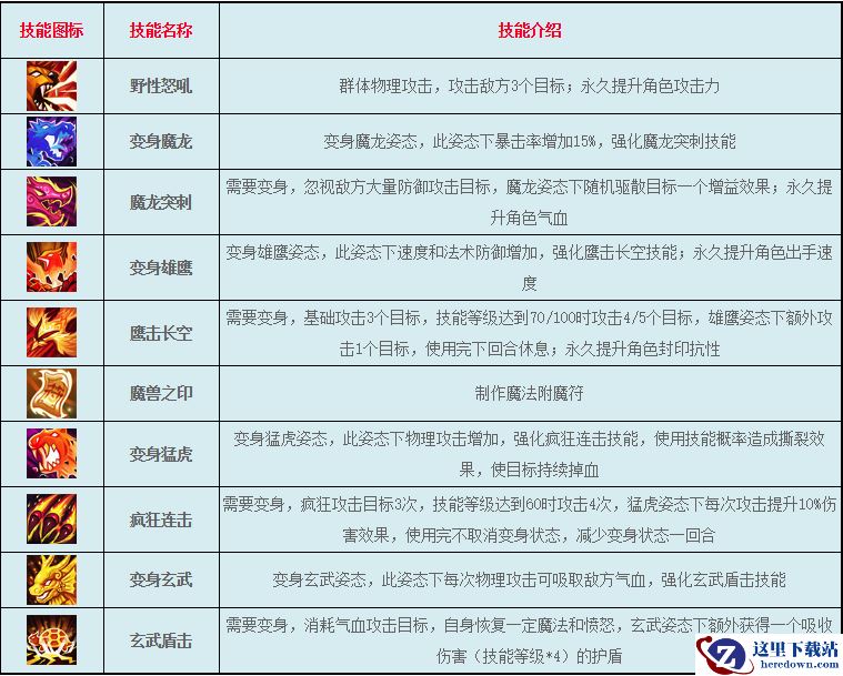PS:兽王宗每种变身都可以放所有技能 只是对应变身的技能会加强
