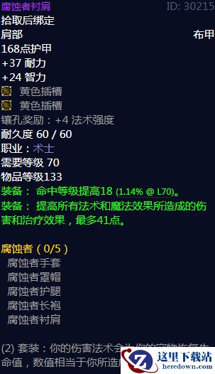 腐蚀者衬肩属性,拾取后绑定,肩部布甲,168点护甲,+37耐力,+24智力,黄色插槽,黄色插槽,镶孔奖励:+4法术强度,耐久度60/60,职业:术士,需要等级70,物品等级133,装备:命中等级提高18(1.14%@L70)。装备:提高所有法术和魔法效果所造成的伤害和治疗效果,最多41点。
