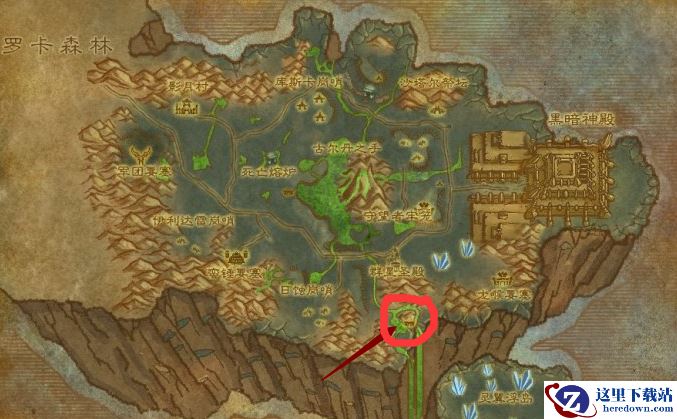 在占星者营地继续望右下跑,过了条叫什么什么小径的地方,在地图的边缘就能看到暗影祭坛了