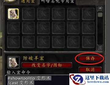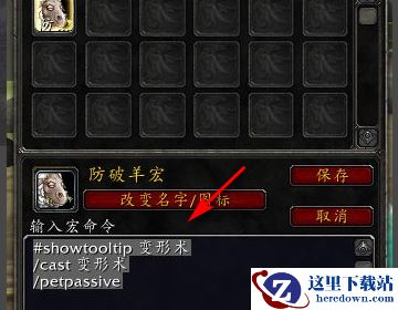 4、在输入宏命令框内,输入以下内容,对目标施放变形术,同时取消水元素的攻击,防止破羊。
