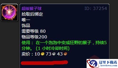 “超级猴球”是一款玩具类的装饰品,在5分钟内可以变身为一只巨大的白色猩猩。变身之后,他可以骑着马,会飞,会变成小德,会用武器攻击,也会用其他的变形装备遮住大猩猩的身体,然后把这个特殊的光团保存下来。可以说,用这东西在达拉然站街的时候,绝对是百分百比的橙斧,如果不是他仔细观察,他还真不一定能发现,但是这颗巨大的紫色圆球,却是一目了然。