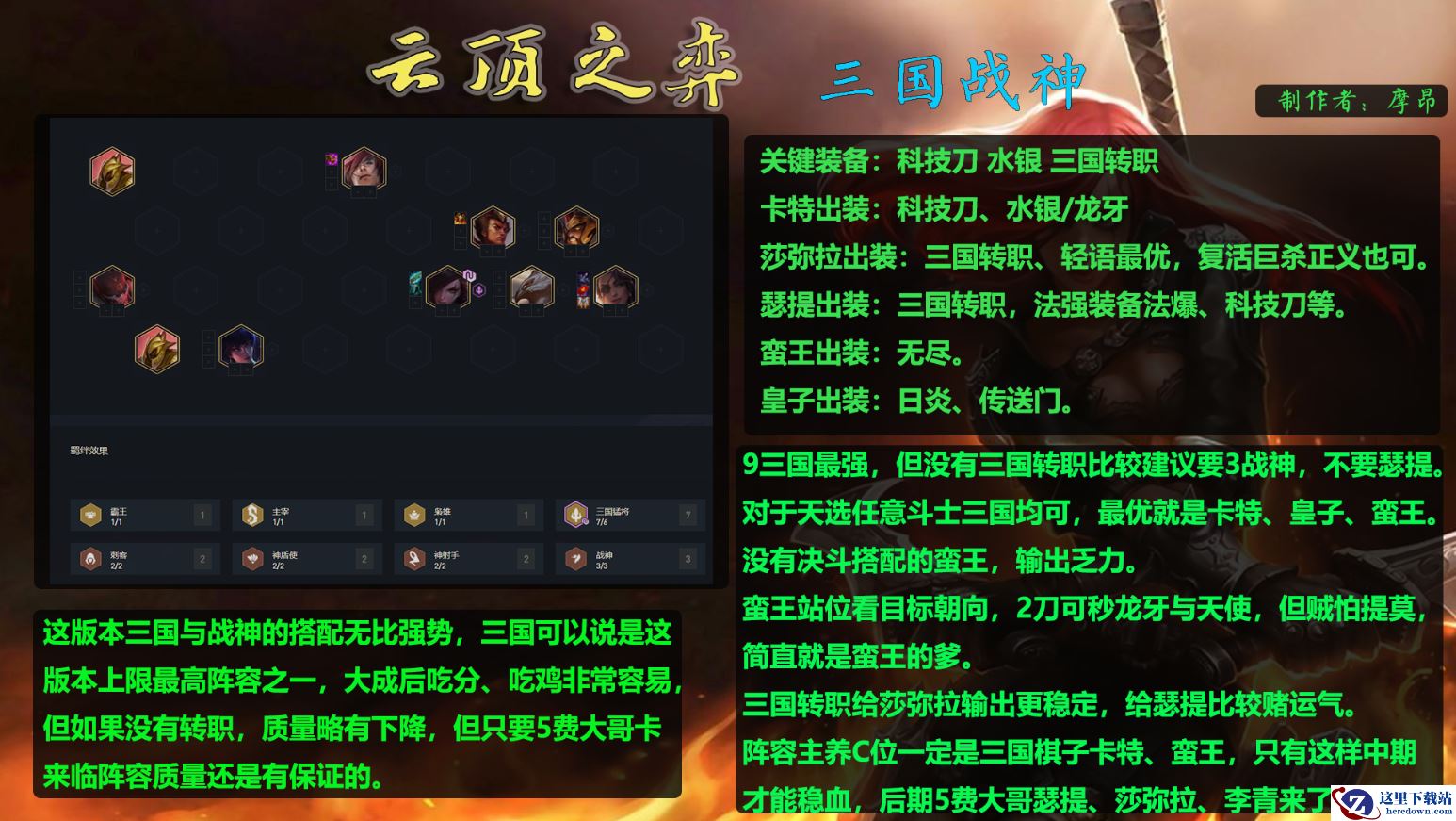 云顶之弈11.5三国战神阵容搭配这版本莎弥拉被小削弱,挂瑟提还是三战神感觉强度上相差不大了,都是可以考虑了,主要就看谁先来莎弥拉和李青先来就用莎弥拉,反之就瑟提。