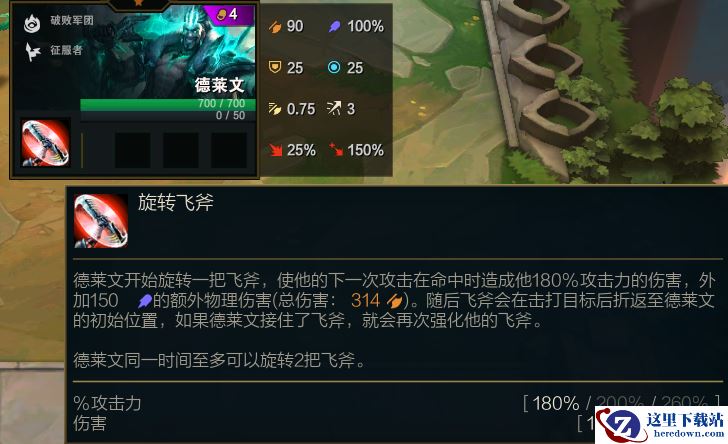 云顶之弈S5德莱文属性德莱文开始旋转一把飞斧,使他的下一次攻击在命中时造成他180%攻击力的伤害,外加150的额外物理伤害。随后飞斧会在击打目标后折返至德莱文的初始位置,如果德莱文接住了飞斧,就会再次强化他的飞斧。德莱文同一时间至多可以旋转2把飞斧。