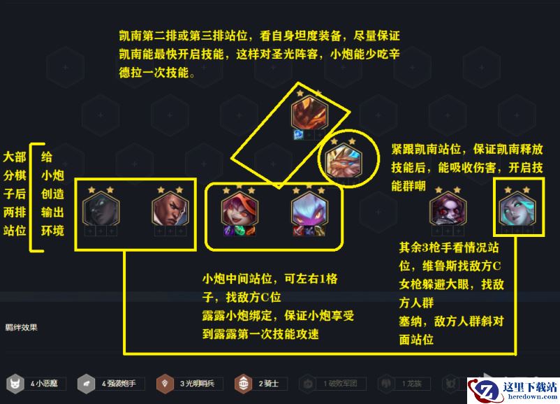 阵容关键羁绊:4小恶魔败+4炮手+3哨兵。