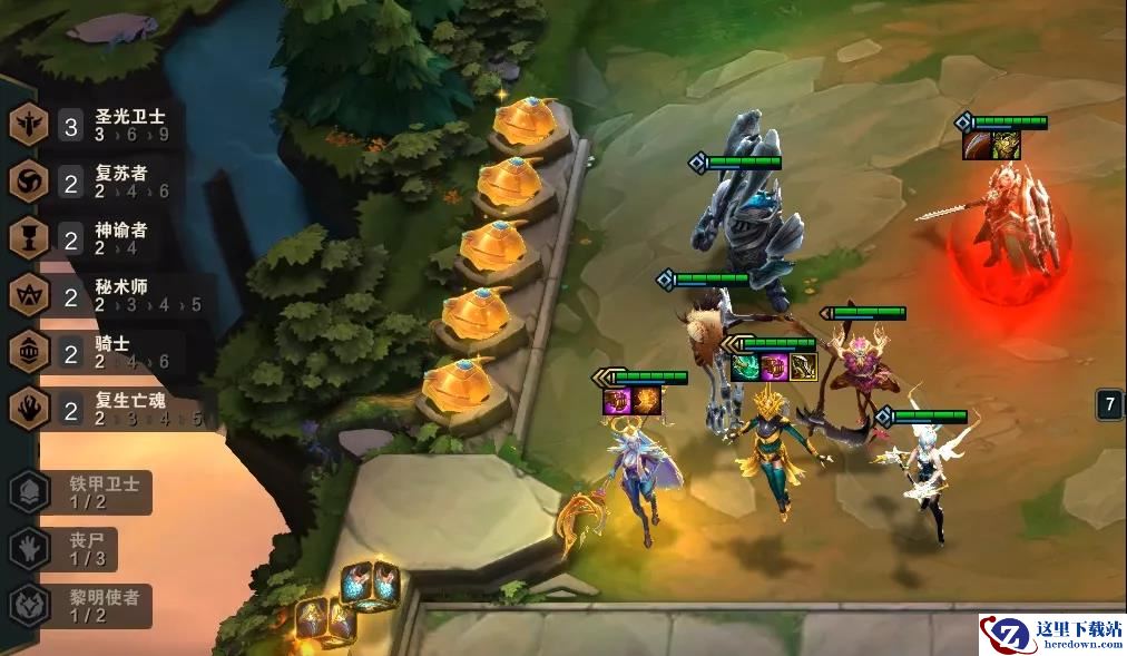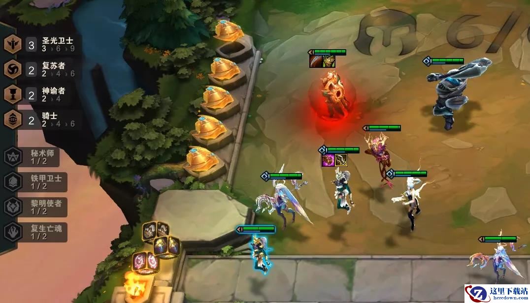 羁绊组成:1神王凯旋 3圣光卫士 2复生亡魂 2铁甲卫士 2骑士 2秘术 2复苏者 2神谕者 2黎明使者(拉9还可上3秘术或3复生)