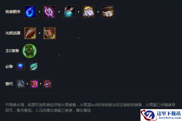 开局拿水滴,前面可连败养经济做火男装备,火男蓝buff科技枪做出后主做前排装备,火男第三件随缘带即可,鬼书最佳。人马和猪女谁能三养谁,猪女最佳。