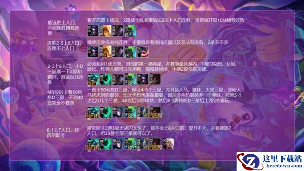 连胜的好2-3都可以跳5继续稳连胜,前期不连胜就要2-3自然4人口,2-5不上人口,最大化利息,并且尽可能精致5连败,因为没有装备需求,不用刻意卖血,主要是馋那个钱,有护甲的时候连败选秀可以拿铲子,重骑转火男天胡,但是手上起码有一个眼泪,要优先保证蓝BUFF,别什么都不沾边的时候还拿一堆散件。