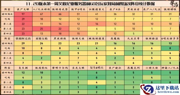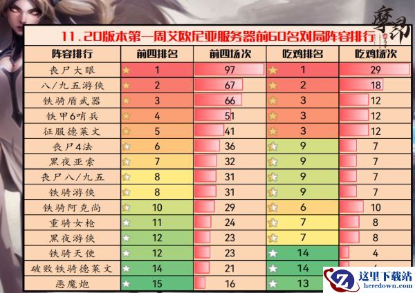 本次摩昂统计了这周艾欧尼亚服务器排名前60名大神们的最近5场排位赛,统计排位进入前4名的对局。大家可在图中清晰看到各个阵容对局的一、二、三、四名,能更容易理解阵容趋势变化与阵容强度。