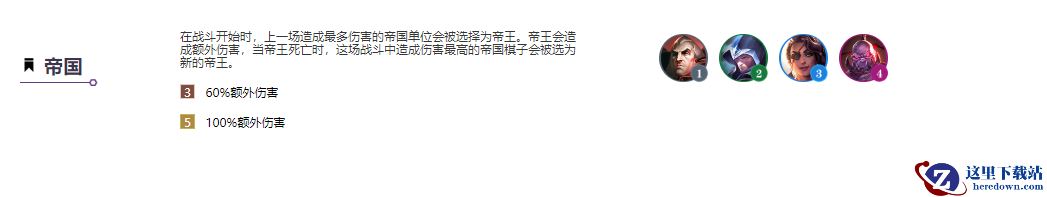 帝国刺:帝国的羁绊效果是上场战斗造成最多伤害的棋子在本场战斗中可以获得额外伤害加成,配合刺客羁绊的伤害,伤害直接爆表,s6赛季刺客主c依旧是萨科和阿卡丽,配合帝国的额外加成,可以打出不俗的伤害,妥妥的后排去质器。