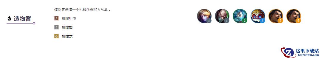 造物巨人:巨人羁绊是占双人口的羁绊,免疫控制,是强力棋子,但是自身却占有两个人口,而六造物者的羁绊可以额外召唤机械龙加入战斗,且召唤物属性十分强力,弥补了巨人羁绊多占的人口差距,同人口情况下,拥有两个强力棋子,上分稳定性极高。
