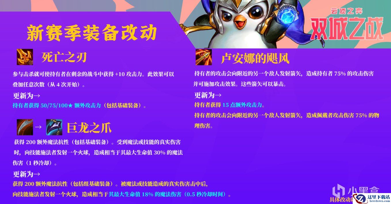 死亡之刃(杀人剑)重做,现在死亡之刃,不在叠加层数,而是根据星级直接增加攻击力,3星最多增加100攻击力,可预见回是新赛季比较热门的输出装。